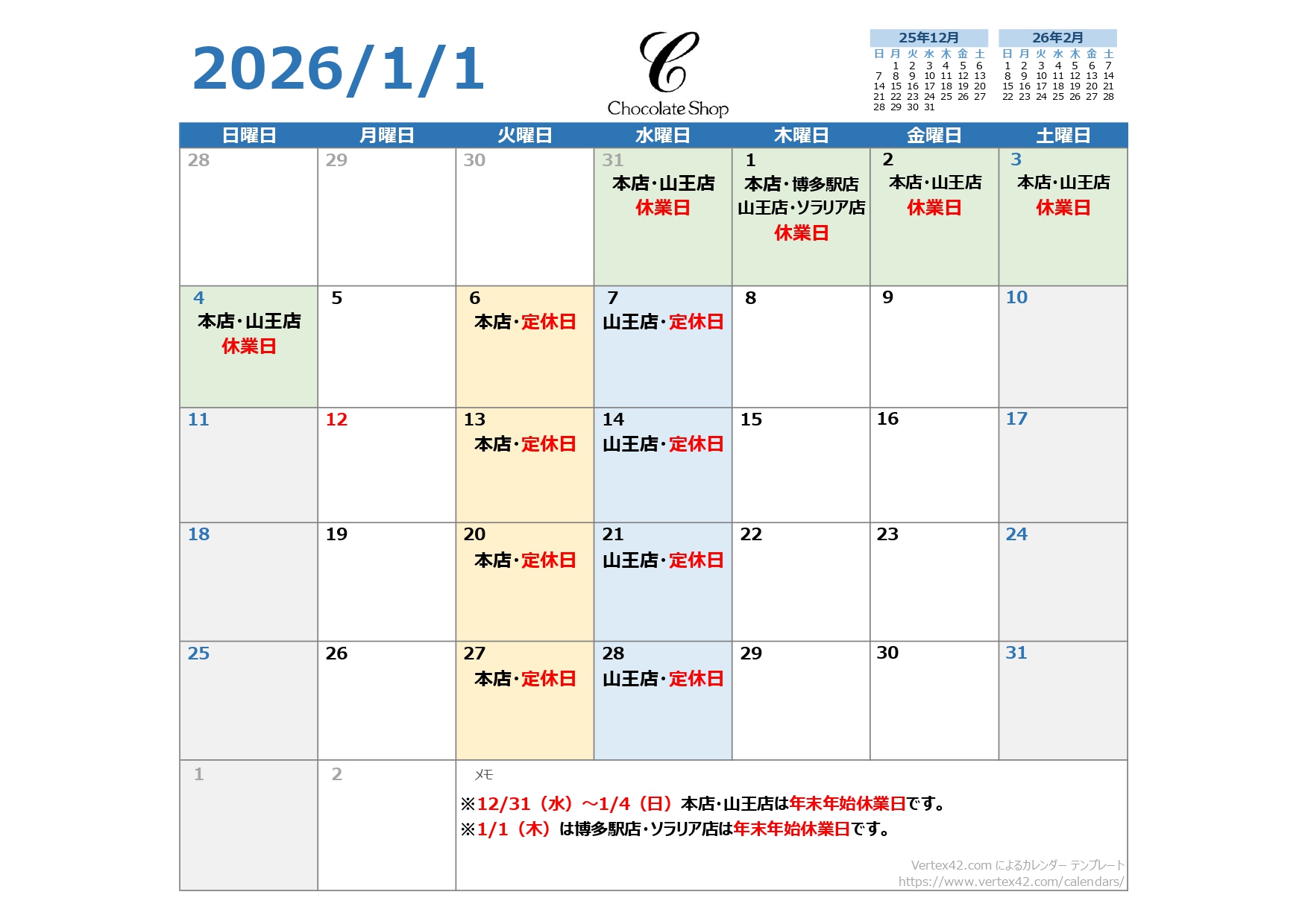 2026年1月店休日のお知らせ