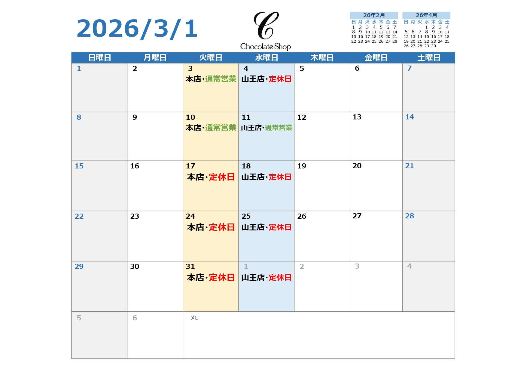 2026年3月店休日のお知らせ